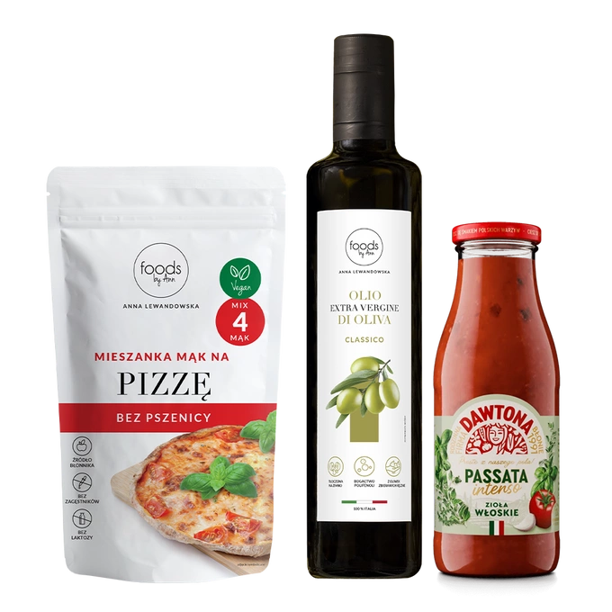 Wheat-free pizza flour mix + Classico olive oil + Dawtona passata