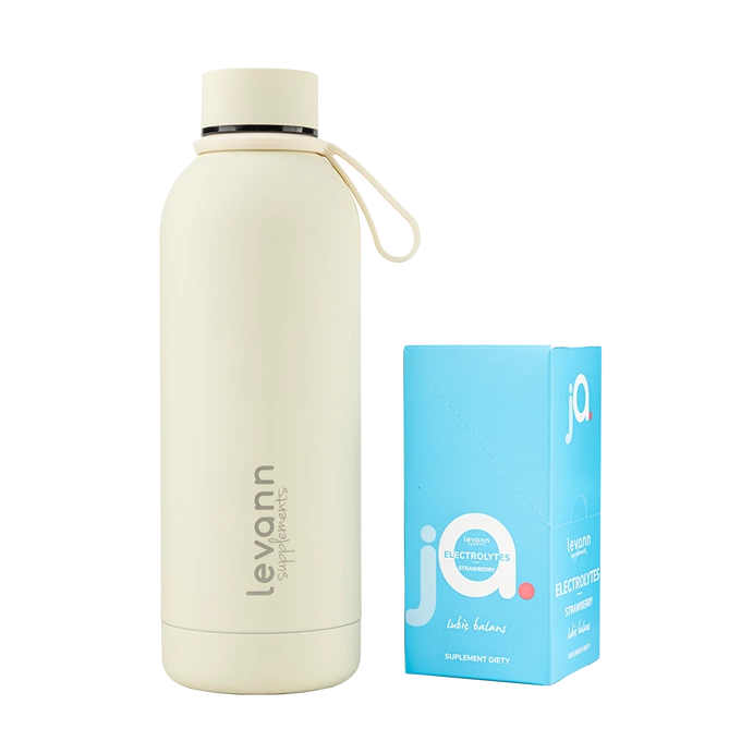 - Zestaw stworzony z myślą o pełnym nawodnieniu - butelka termiczna ze stali nierdzewnej + Levann "jA" Electrolytes. Przygotuj się na upalne dni i zawsze miej pod ręką chłodny napój, który uzupełni najważniejsze witaminy i minerały.